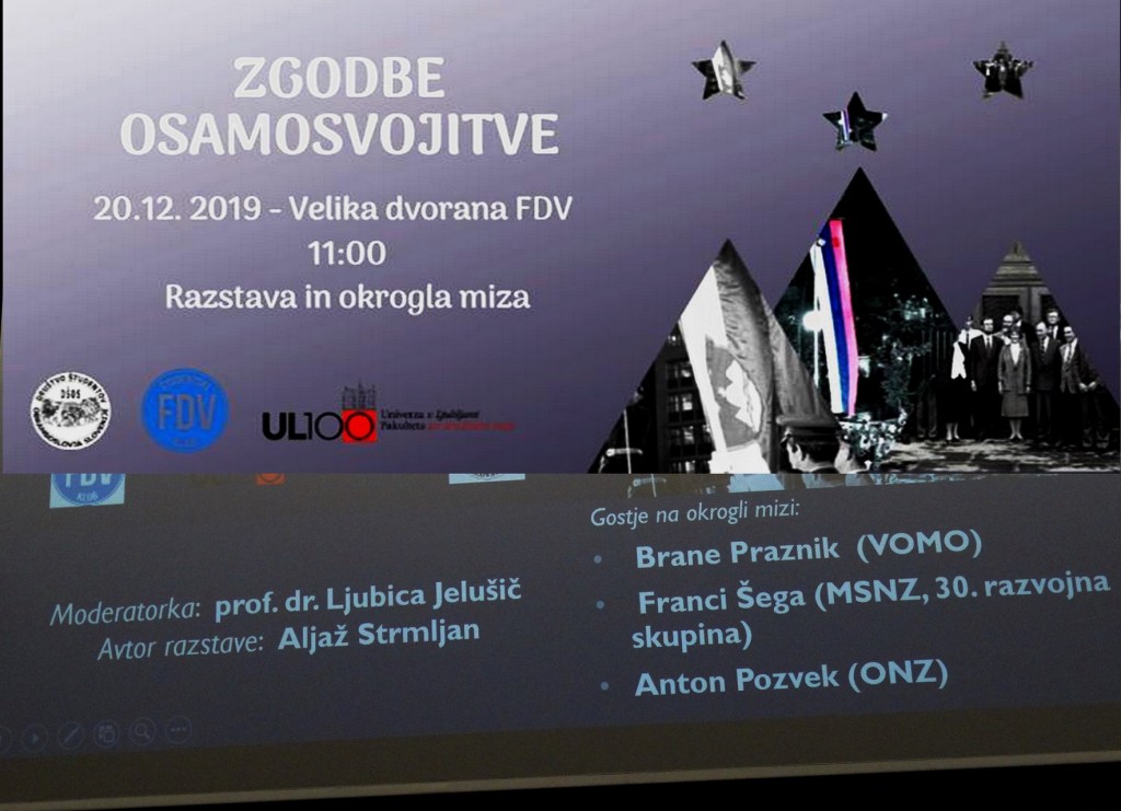 Ob podpori Katedre za obramboslovje, DŠOS in ŠK FDV sem v petek organiziral okroglo mizo in razstavo z naslovom Zgodbe osamosvojitve. Za ta datum smo se odločili zaradi dveh pomembnih obletnic: postroja v Kočevski reki 17. decembra in izvedbe plebiscita 23. decembra 1990.